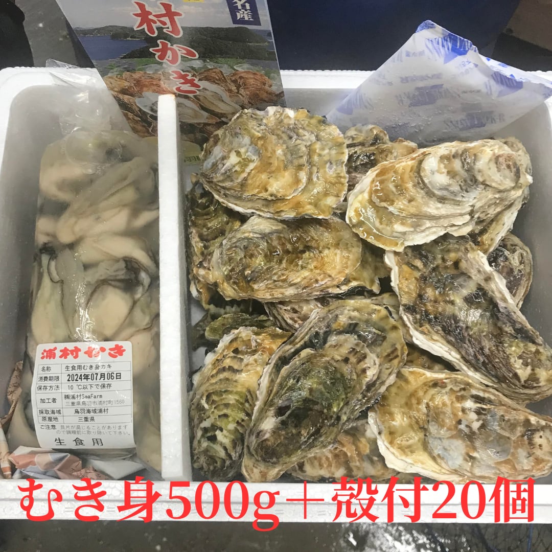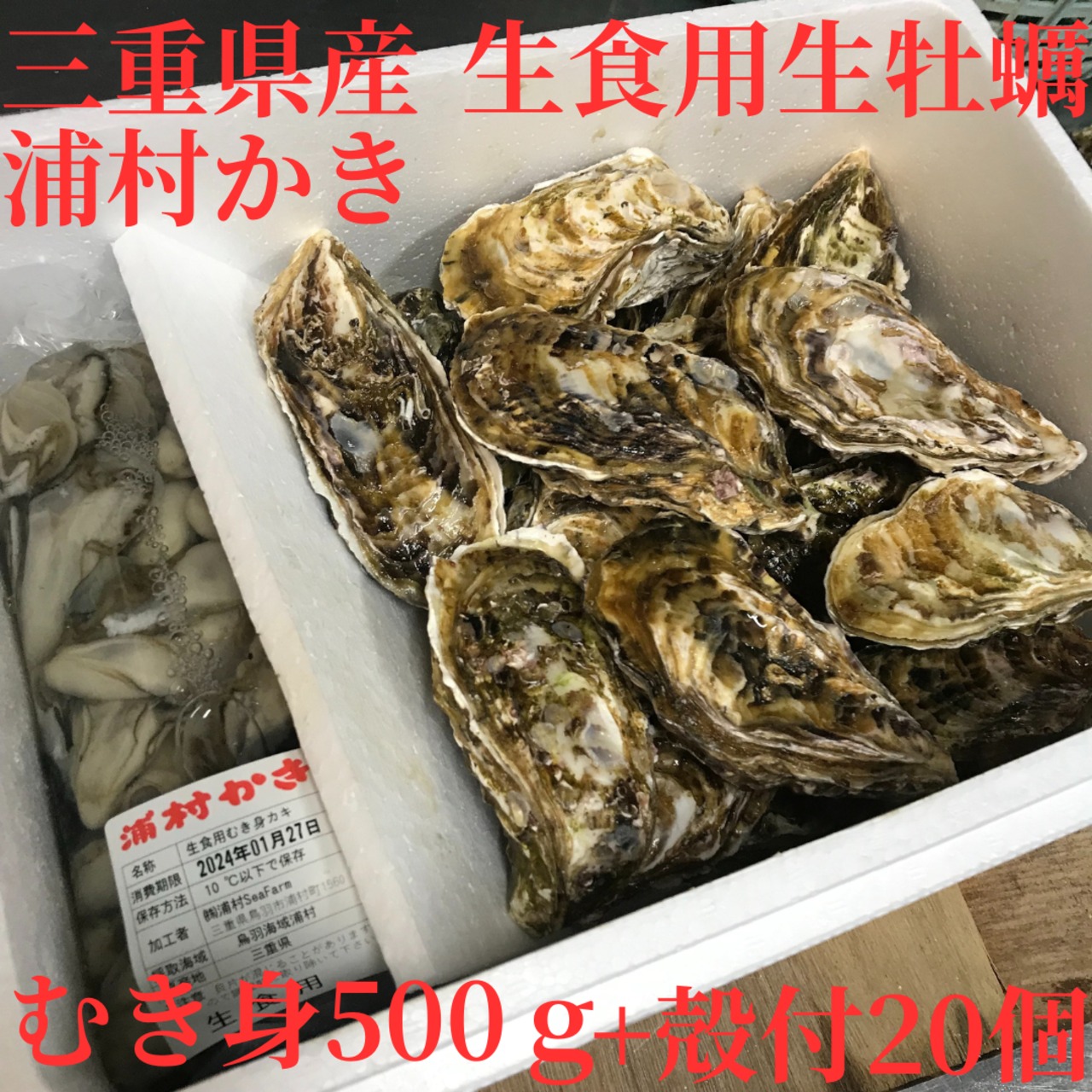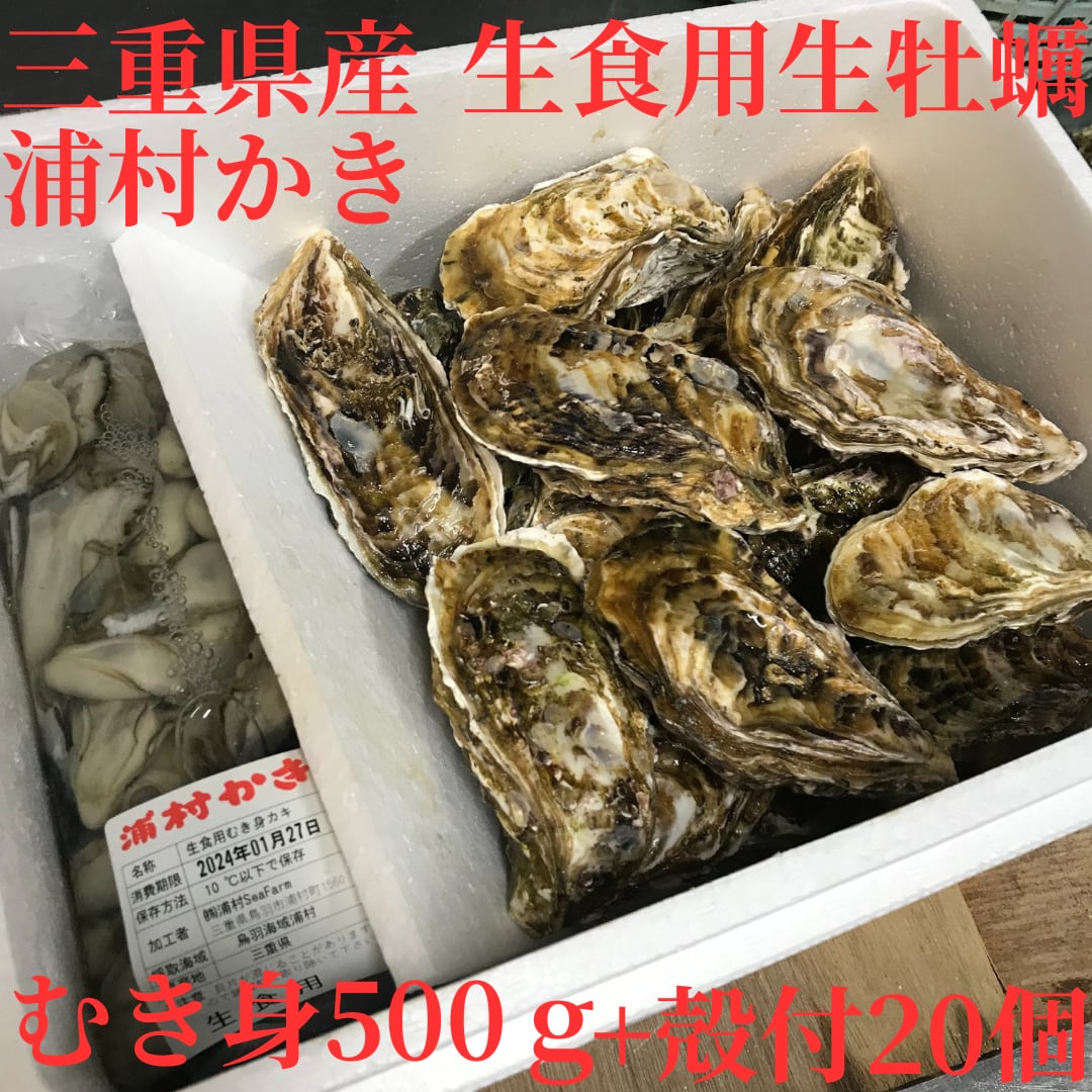【生食用】【贈り物に最適です!】 三重県産 浦村かき 生食用むき身500g+殻付き20個セット(約2.7kg前後)(1~3、4人前)